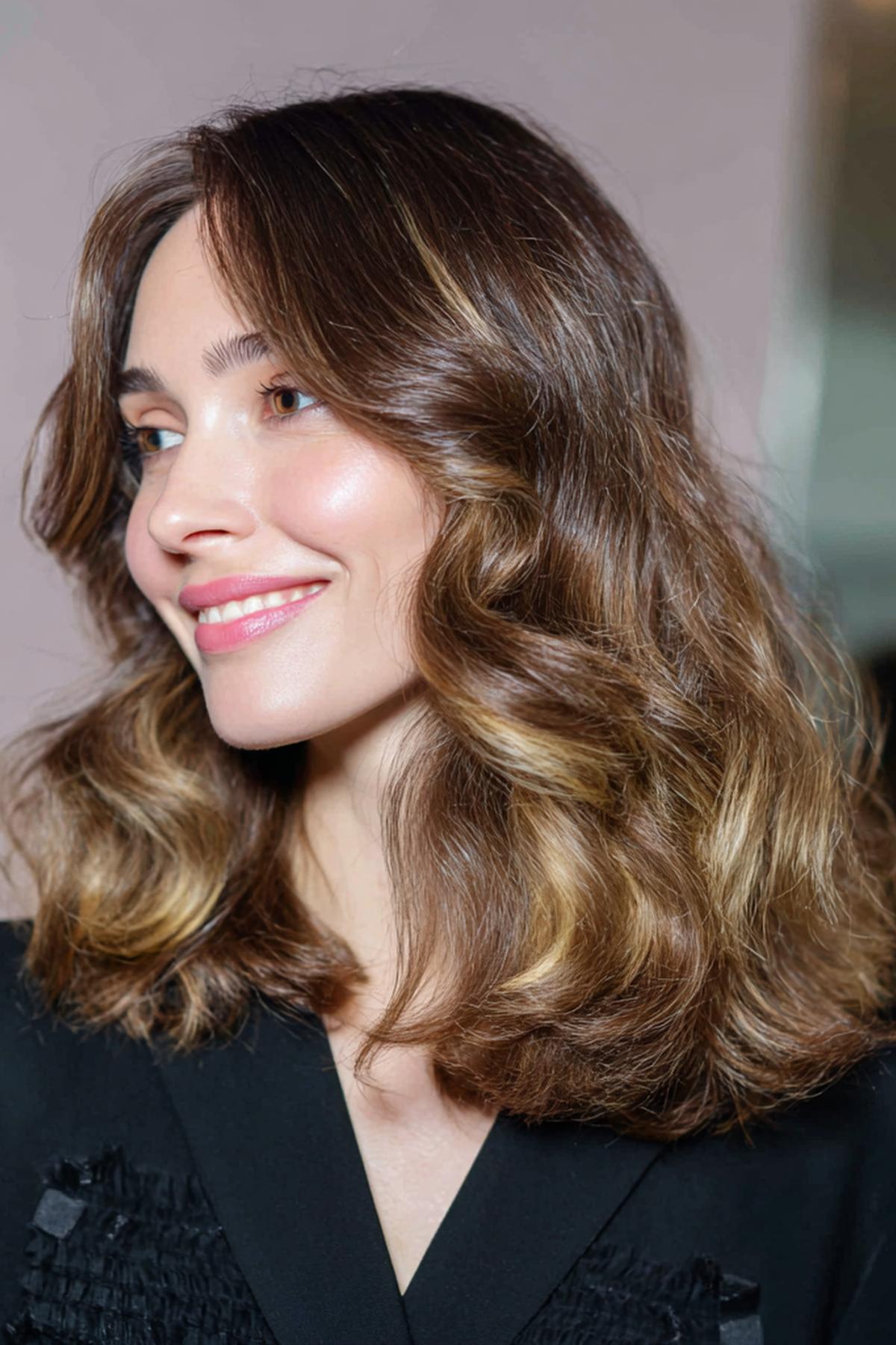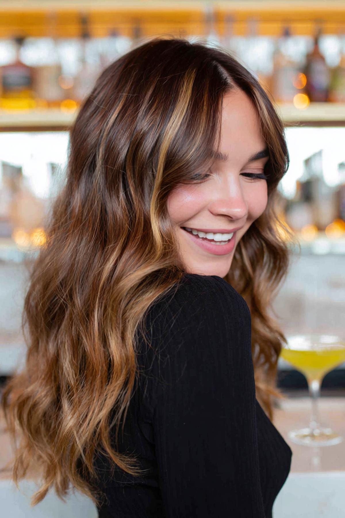 Toffeekleurige veegjes geven warmte aan donkerbruin haar zonder te fel te worden. Perfect voor koelere huidtinten die wat gloed willen. Werkt goed bij dikke, golvende lokken. Pro tip: tone na het kleuren om koperigheid te temmen en het bruin chic te houden.