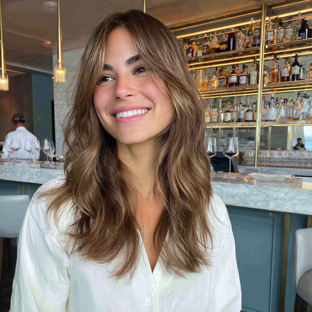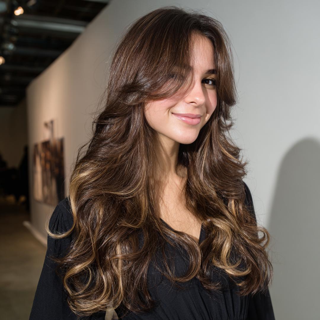 Golvende lagen en zorgvuldig geplaatste highlights bouwen dimensie op zonder streepjes. Ideaal voor lang, dicht haar. Past bij vrijwel elke gezichtsvorm; de slag verzacht hoeken. Voor houdbaarheid: krul op lage warmte en fixeer met lichte hairspray.