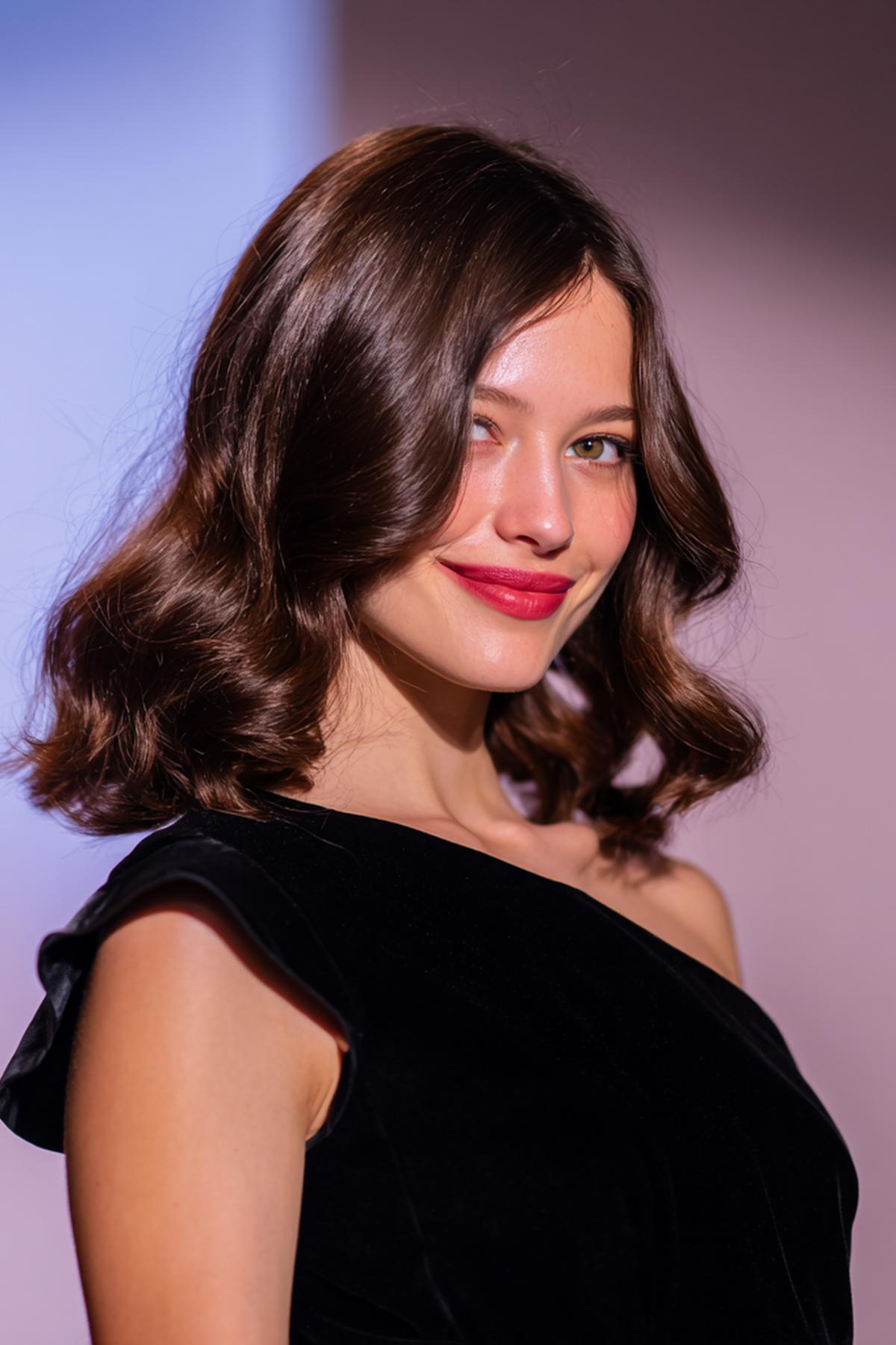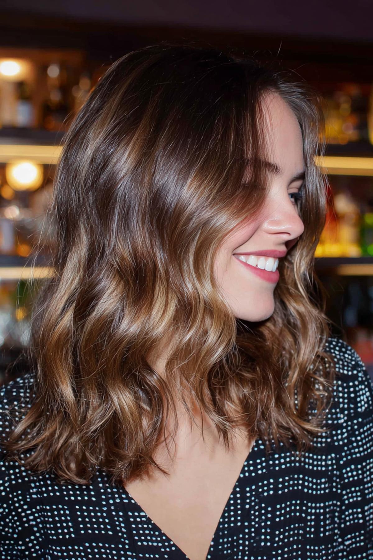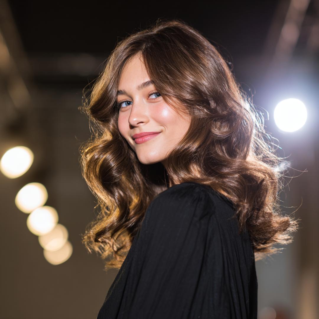 Deze zachte bruine golven met natuurlijke highlights geven diepte zonder te overheersen. Prachtig bij lichte tot medium huidtinten en bij wie volume wil zonder harde lijnen. Werkt super op dik of medium haar. Ik hou van de moeiteloze finish; een grote krultang en een lichte textuurspray volstaan.
