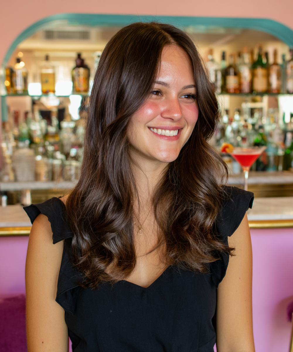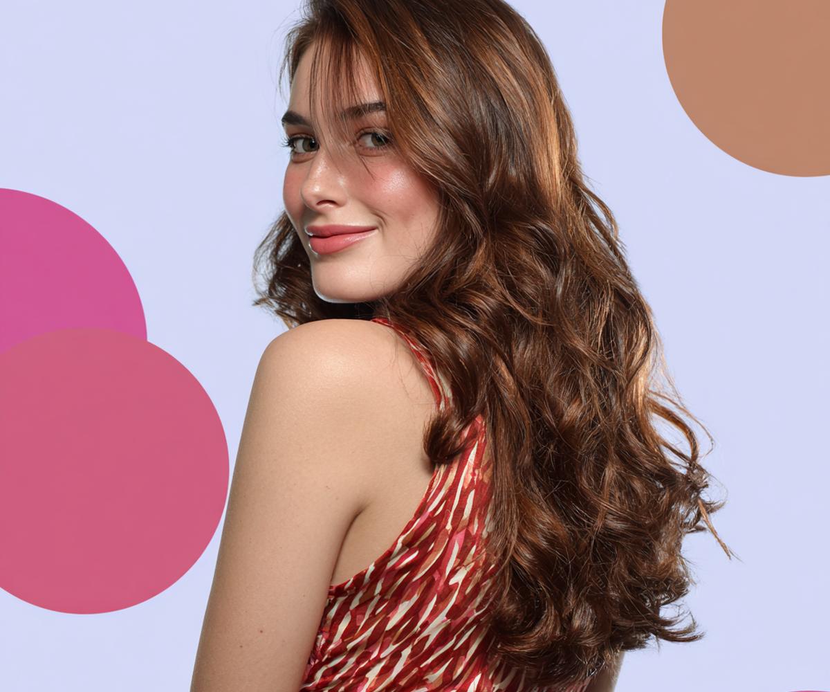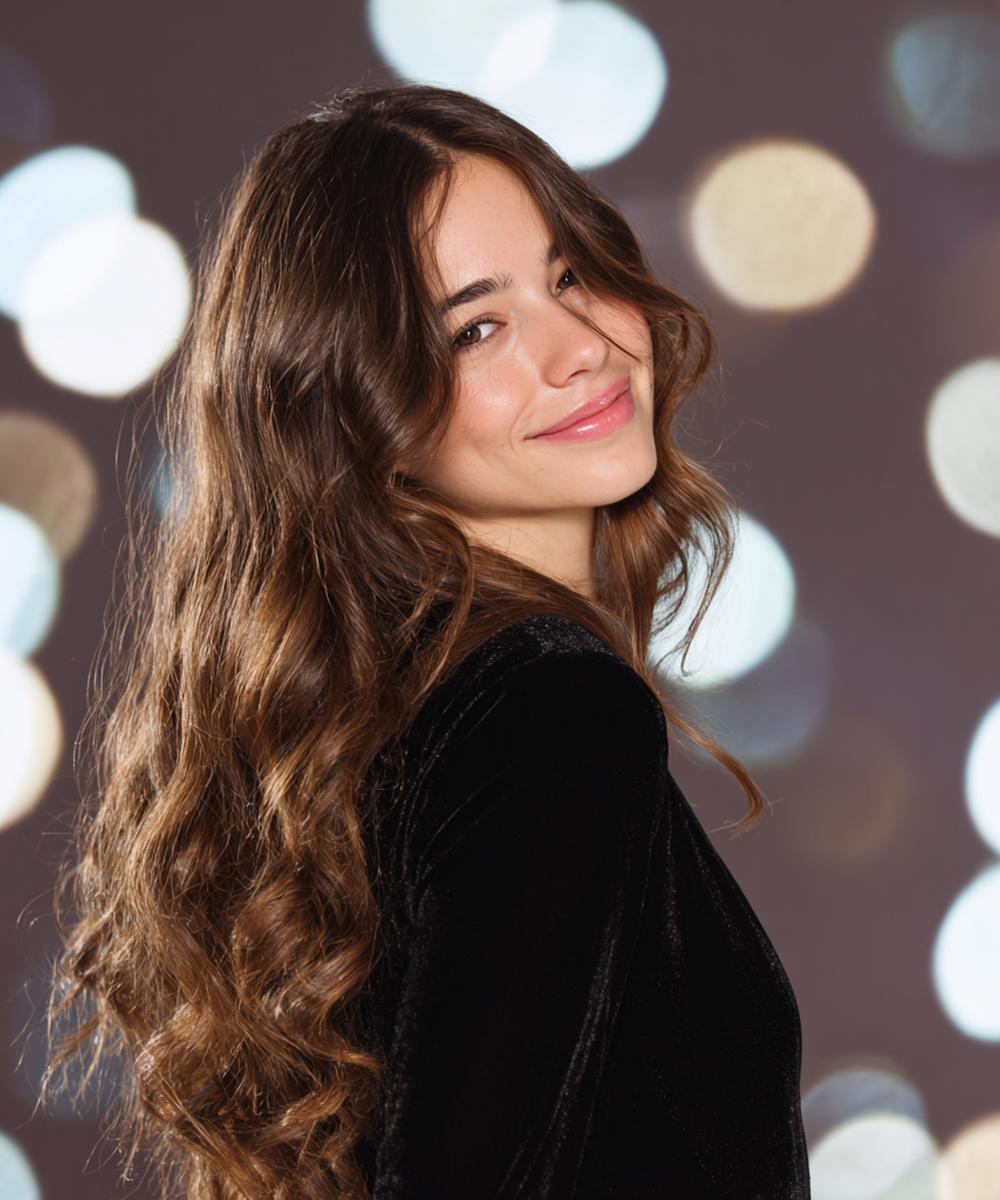 Kastanjebruin met subtiele hoogtepunten geeft een elegante, natuurlijke slag. Werkt goed bij golvend haar dat snel vorm pakt. Fijn voor drukke agenda’s door zachte uitgroei. Diffuseer op laag vuur en knijp een beetje gelcrème in de punten voor definitie.
