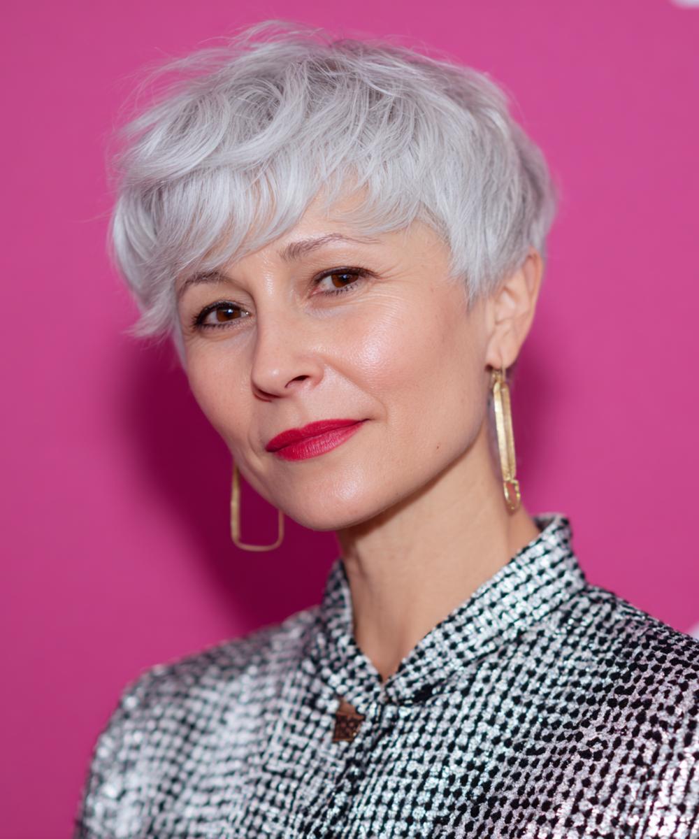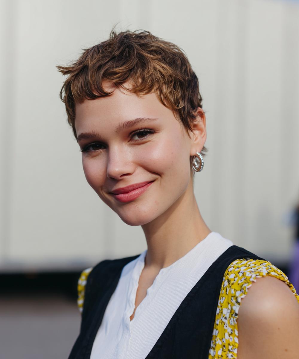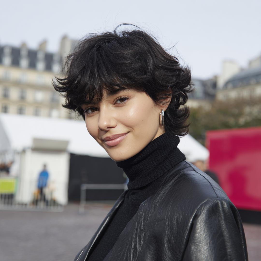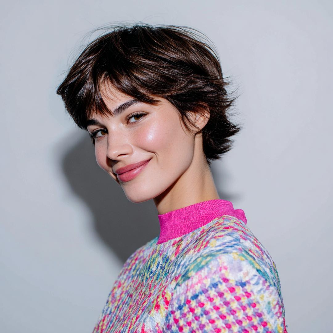 Kısa shag pixie, hacimli üst ve dağınık kakülle enerjik bir ifade veriyor; parlak doku yüz hatlarını vurguluyor.