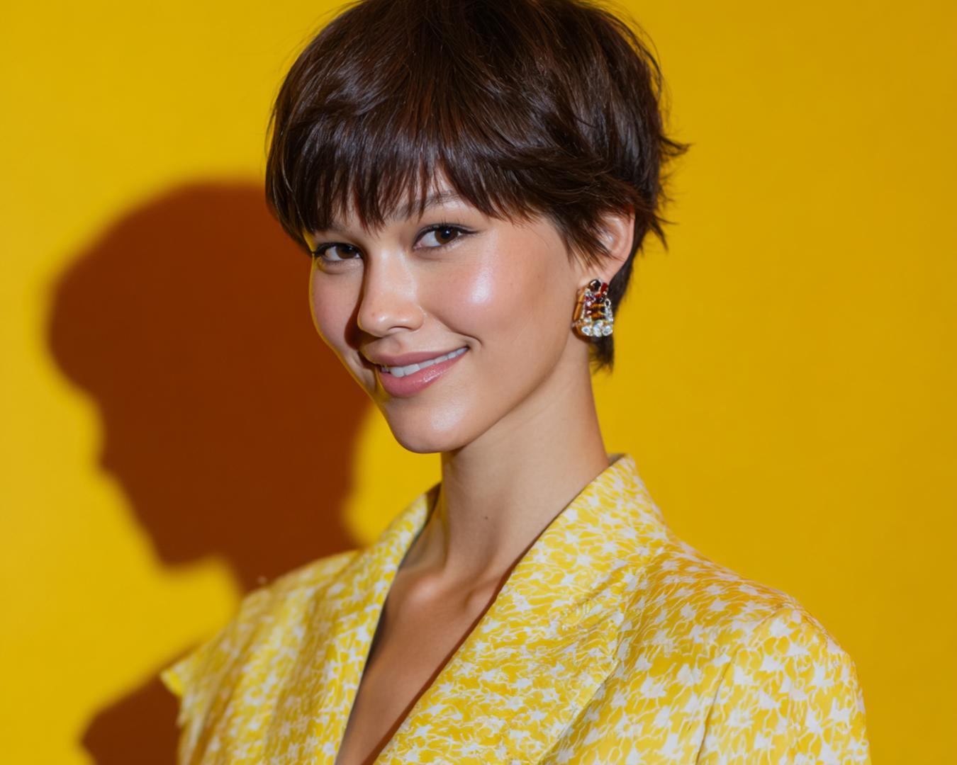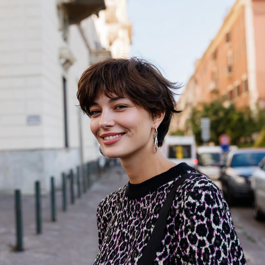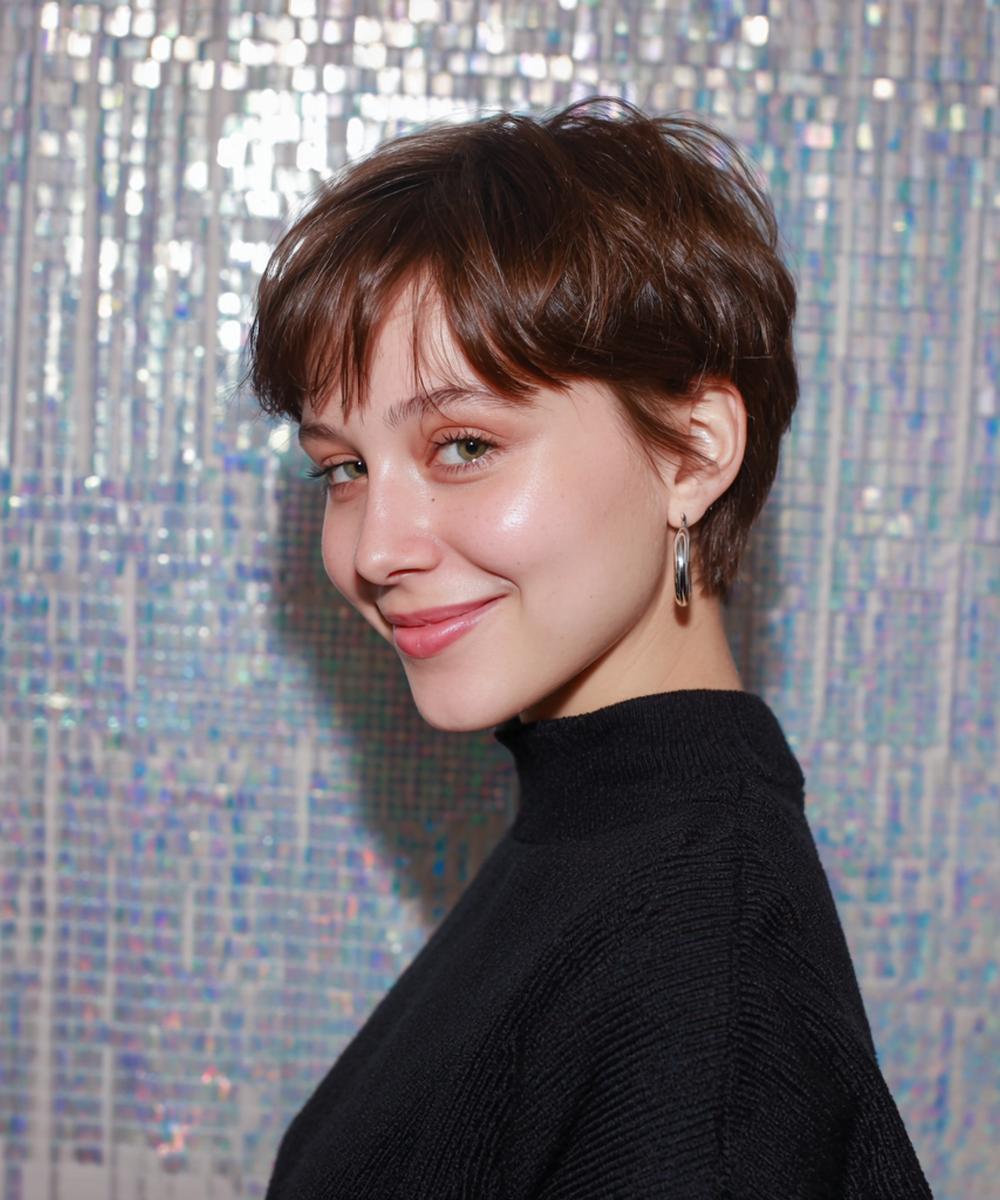 Kısa shag pixie, hacimli üst ve dağınık kakülle enerjik bir ifade veriyor; parlak doku yüz hatlarını vurguluyor.