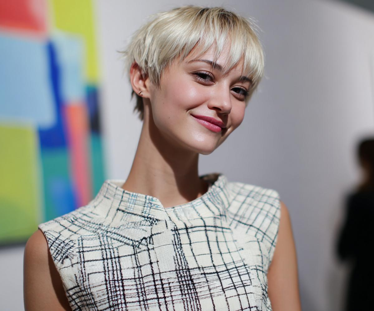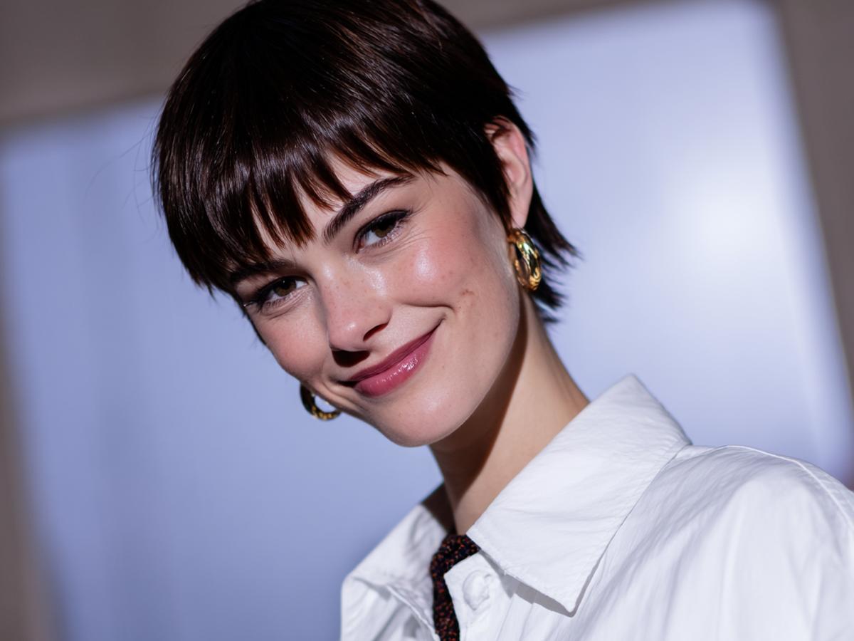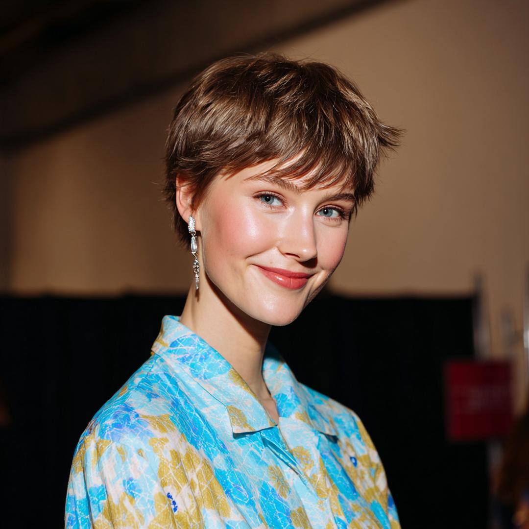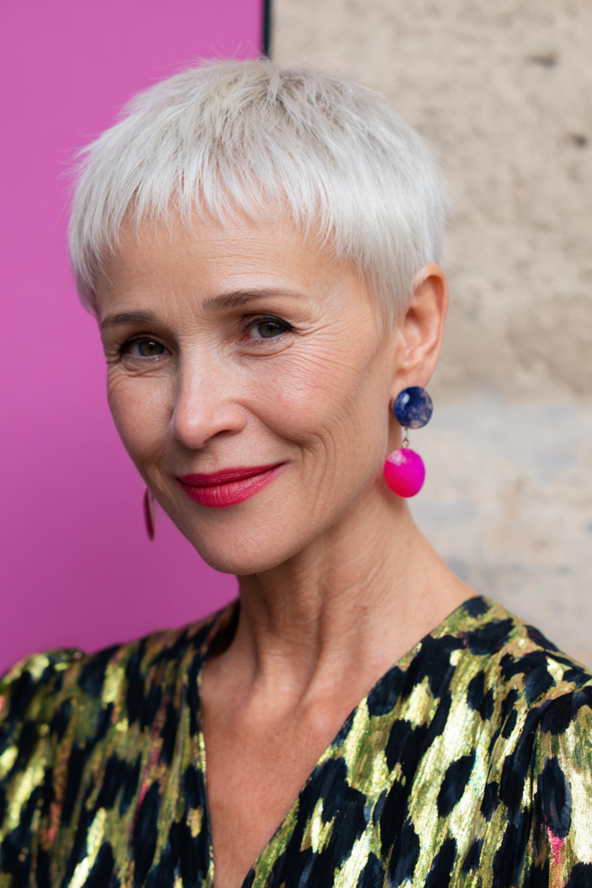 Kısa shag pixie, hacimli üst ve dağınık kakülle enerjik bir ifade veriyor; parlak doku yüz hatlarını vurguluyor.