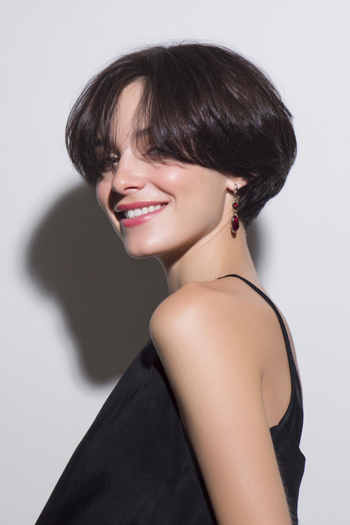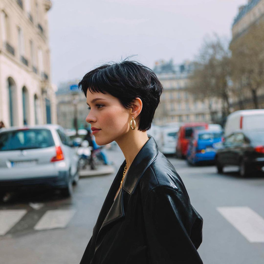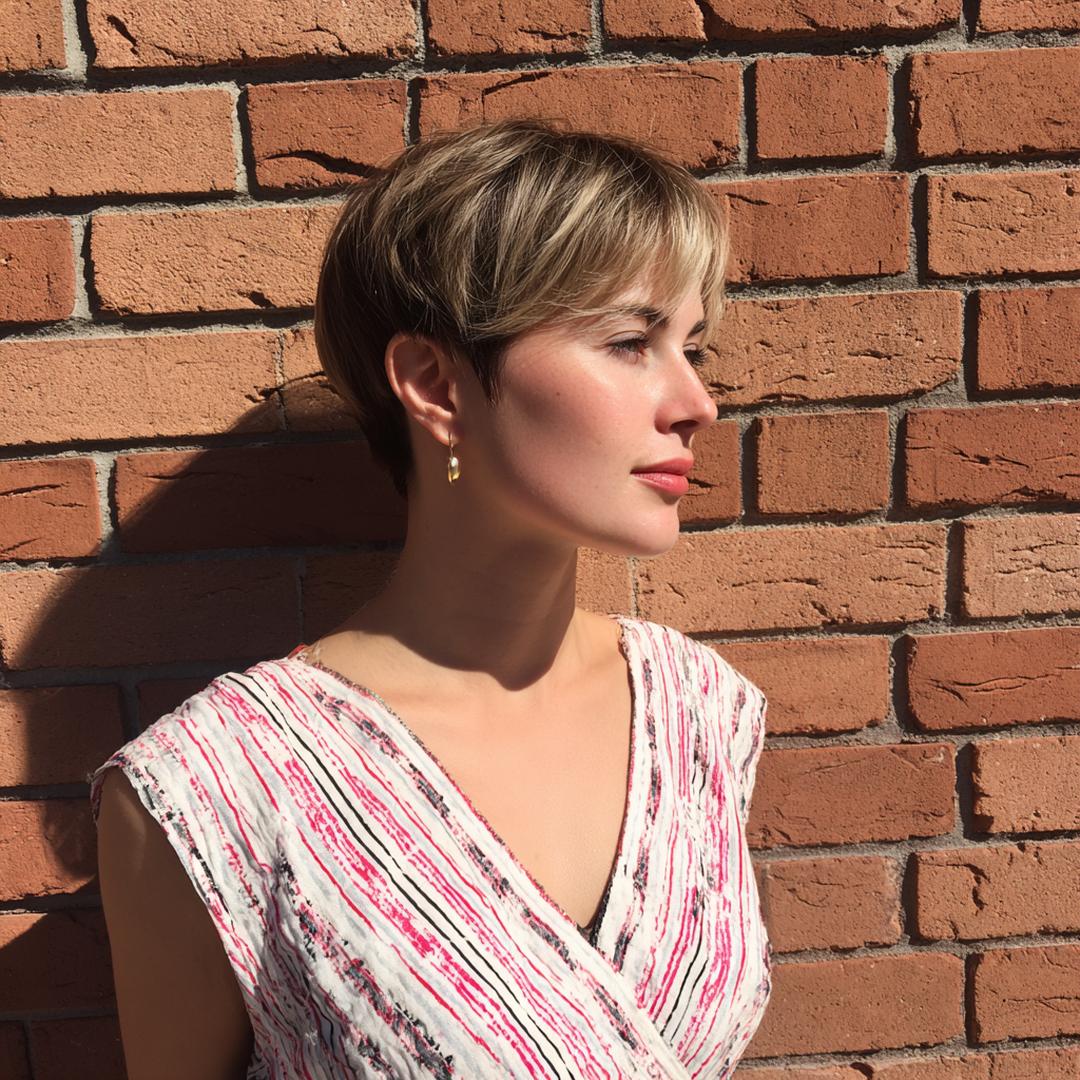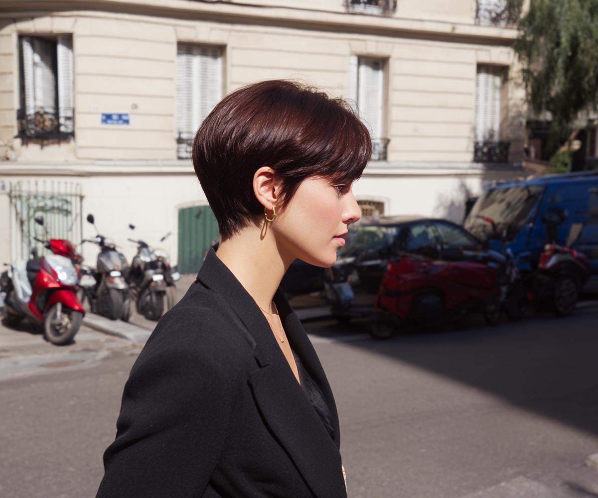 Deze pixie is puur sculptuur: strak in de nek, vol bovenop. Perfect voor minimal styling—een erwt matte paste is genoeg. De zijlijn houdt het vrouwelijk, met heldere contouren en verfijnde textuur.
