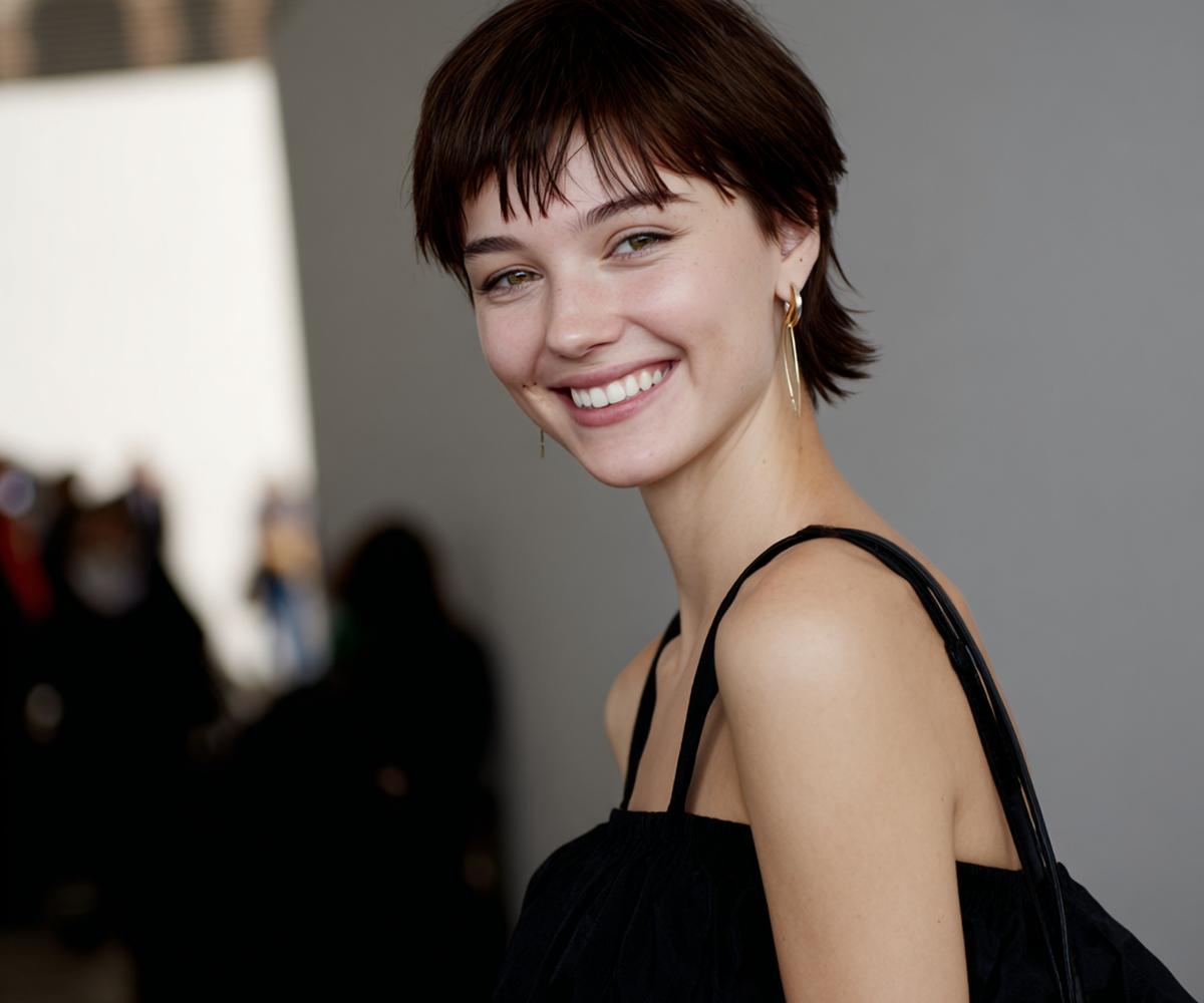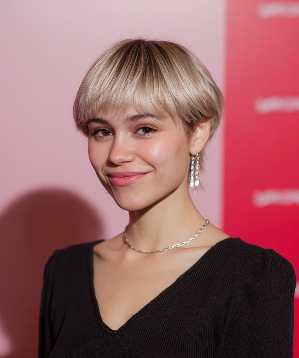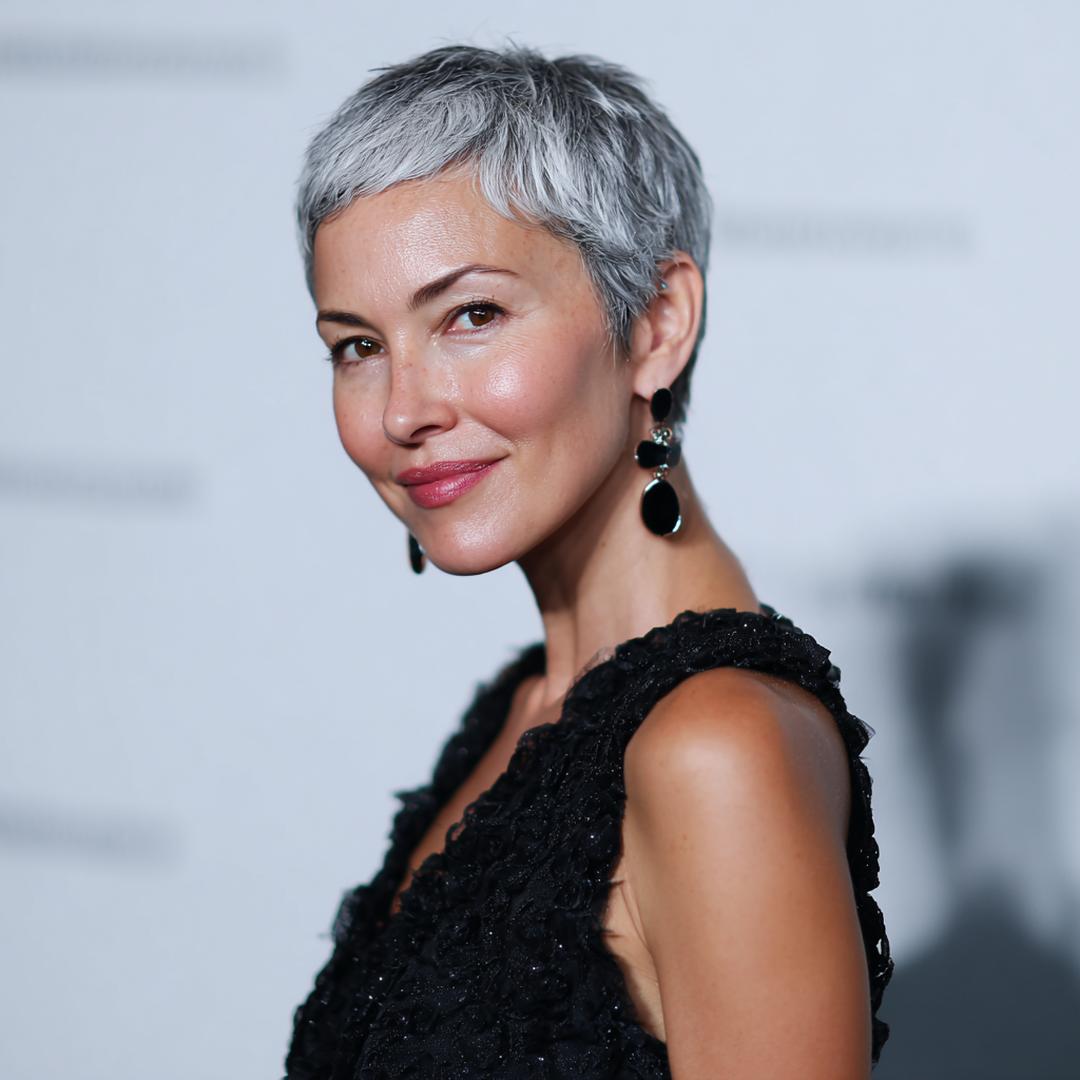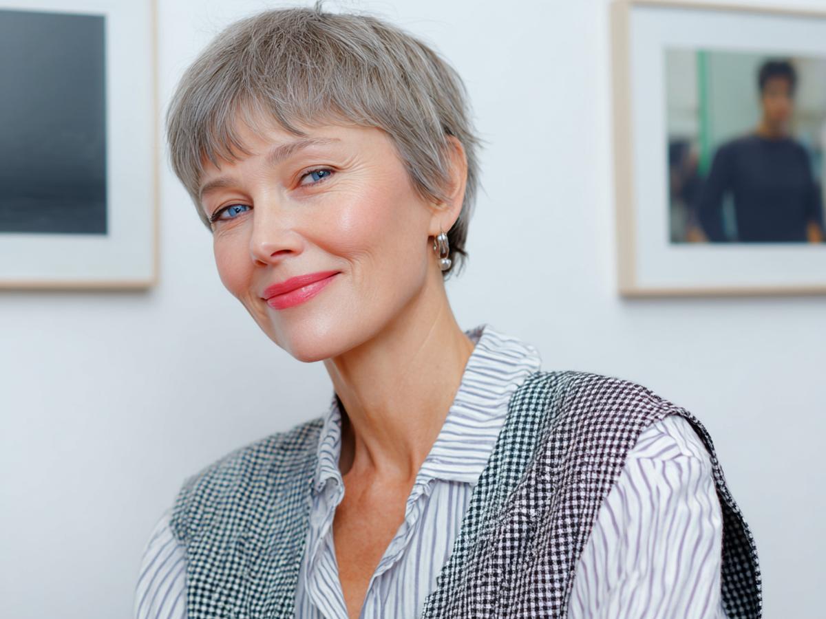 Deze pixie is puur sculptuur: strak in de nek, vol bovenop. Perfect voor minimal styling—een erwt matte paste is genoeg. De zijlijn houdt het vrouwelijk, met heldere contouren en verfijnde textuur.