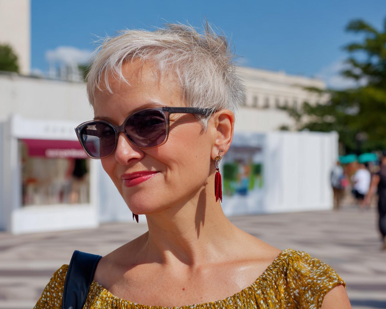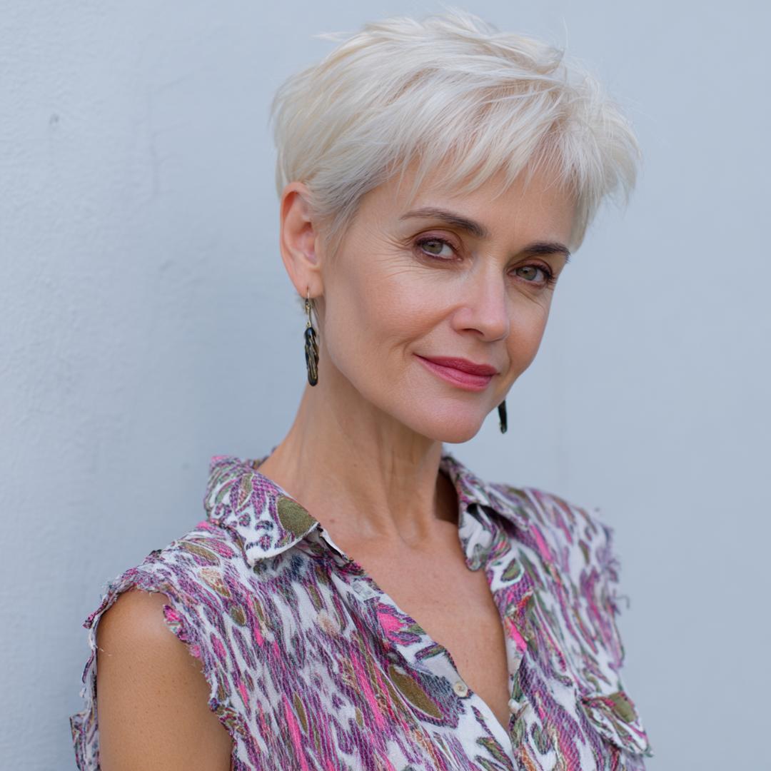 Icy blond en choppy – dit korte kapsel knipt fris door elke look. De koele tint laat de textuur spreken; een drupje crème op de punten houdt het strak, zonder hard aan te voelen.