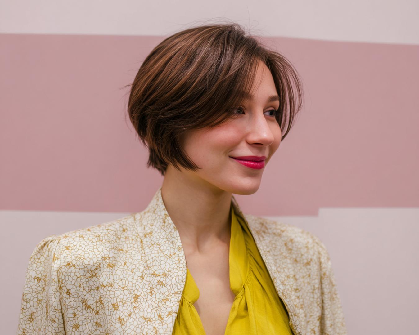 Als stylist ga ik voor een ontspannen finish: korte bob met choppy punten, subtiele lagen en een lichte slag. Een romige stylingcrème geeft natuurlijke glans en houdt alles gewichtloos—een effortless vibe die elke dag werkt.