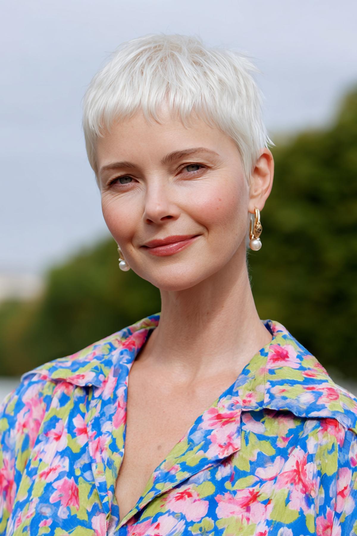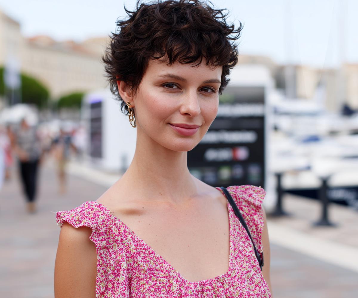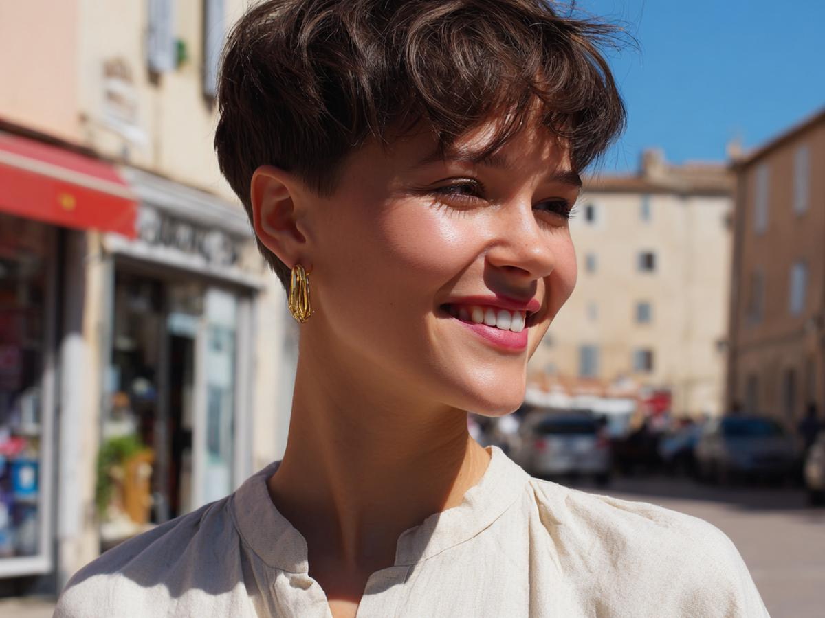 Deze speelse pixie met zachte golven stylen we met krulcrème voor textuur. Ik knijp het droog met de vingers; het resultaat is moeiteloos, luchtig en super flatterend rond ogen en jukbeenderen.