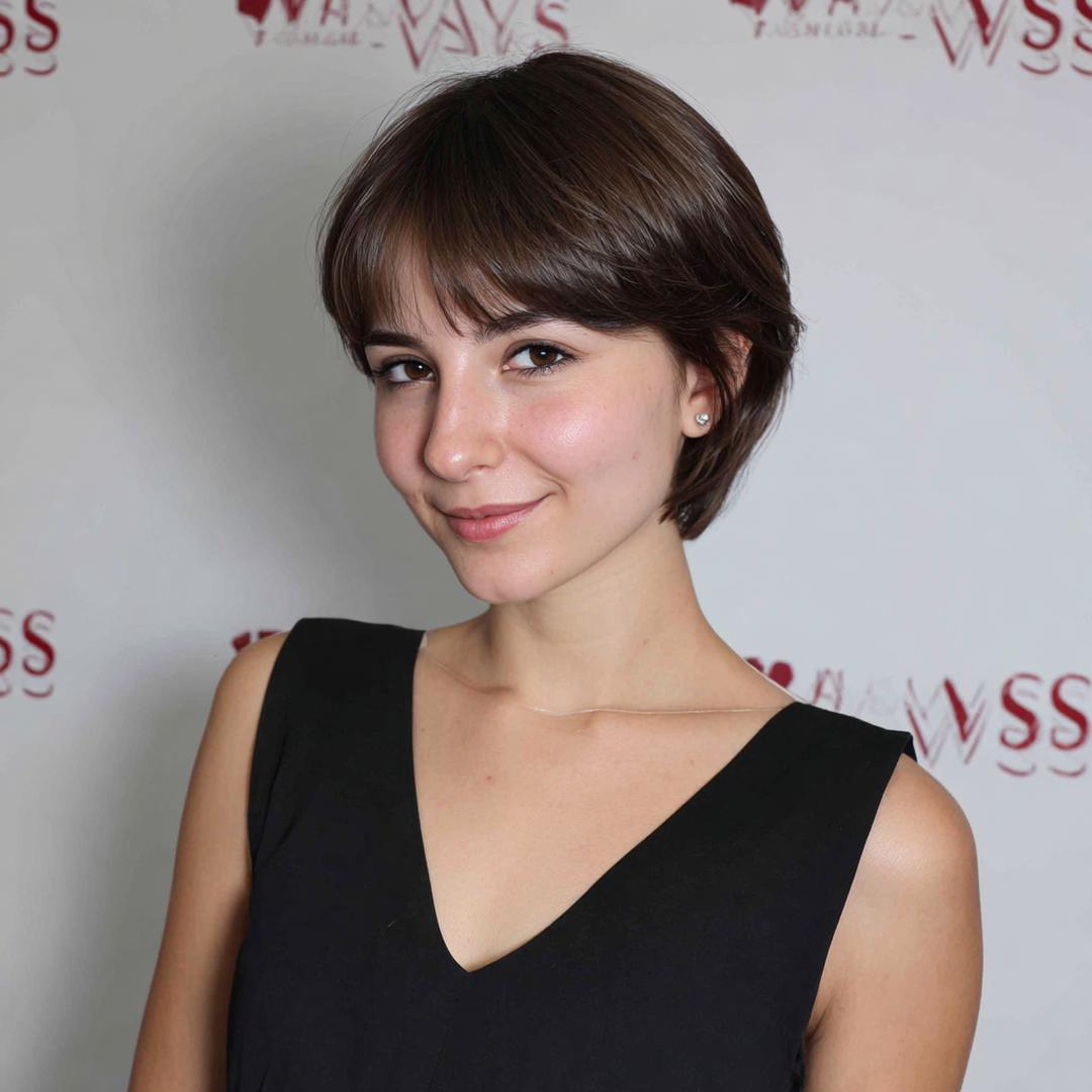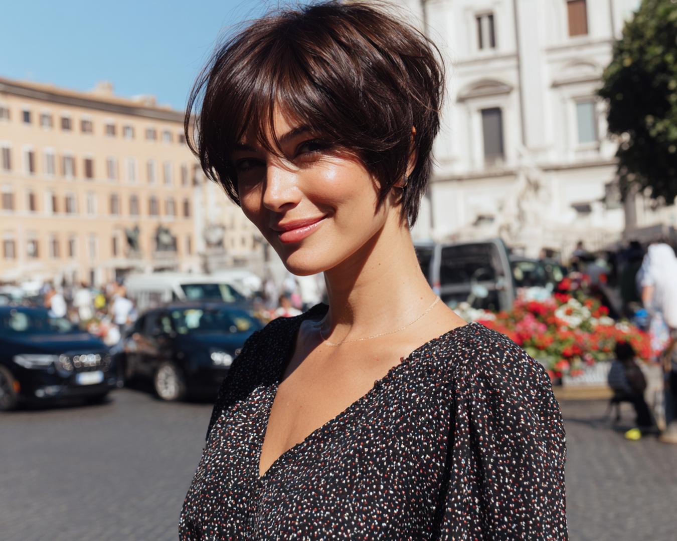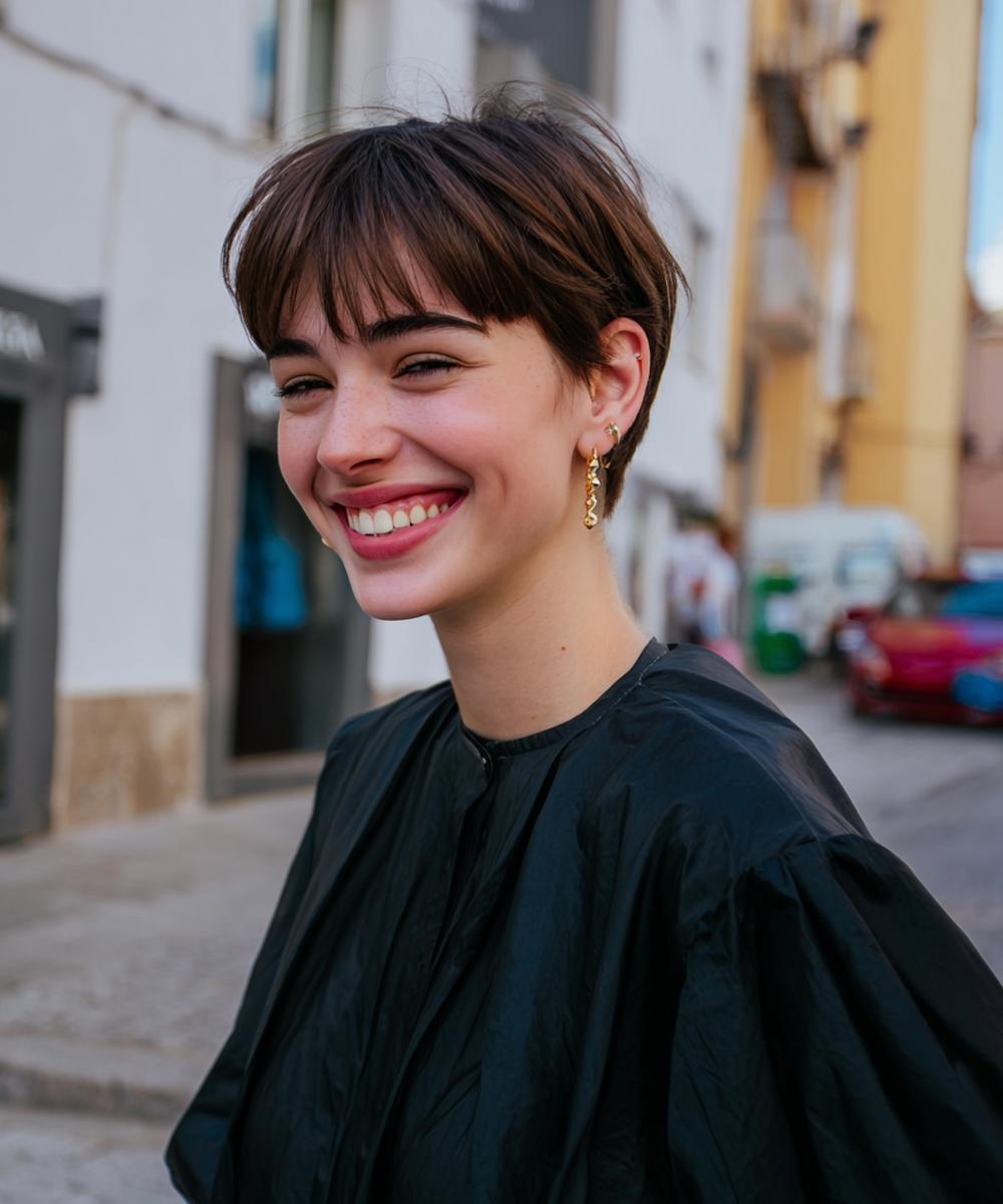 Kırpık kaküllü kısa pixie-bob, katmanlı arka kısım ve yumuşak doku ile hafif ama karakterli bir görünüm sunuyor.