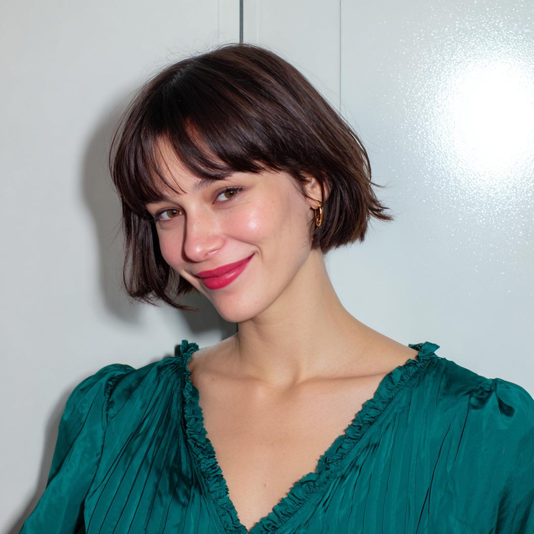 • Volle pony: versterkt de Franse bob en accentueert jukbeenderen; föhn met ronde borstel, daarna licht kneden voor nonchalance.