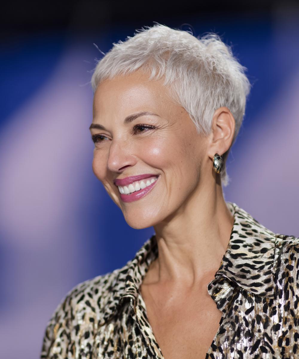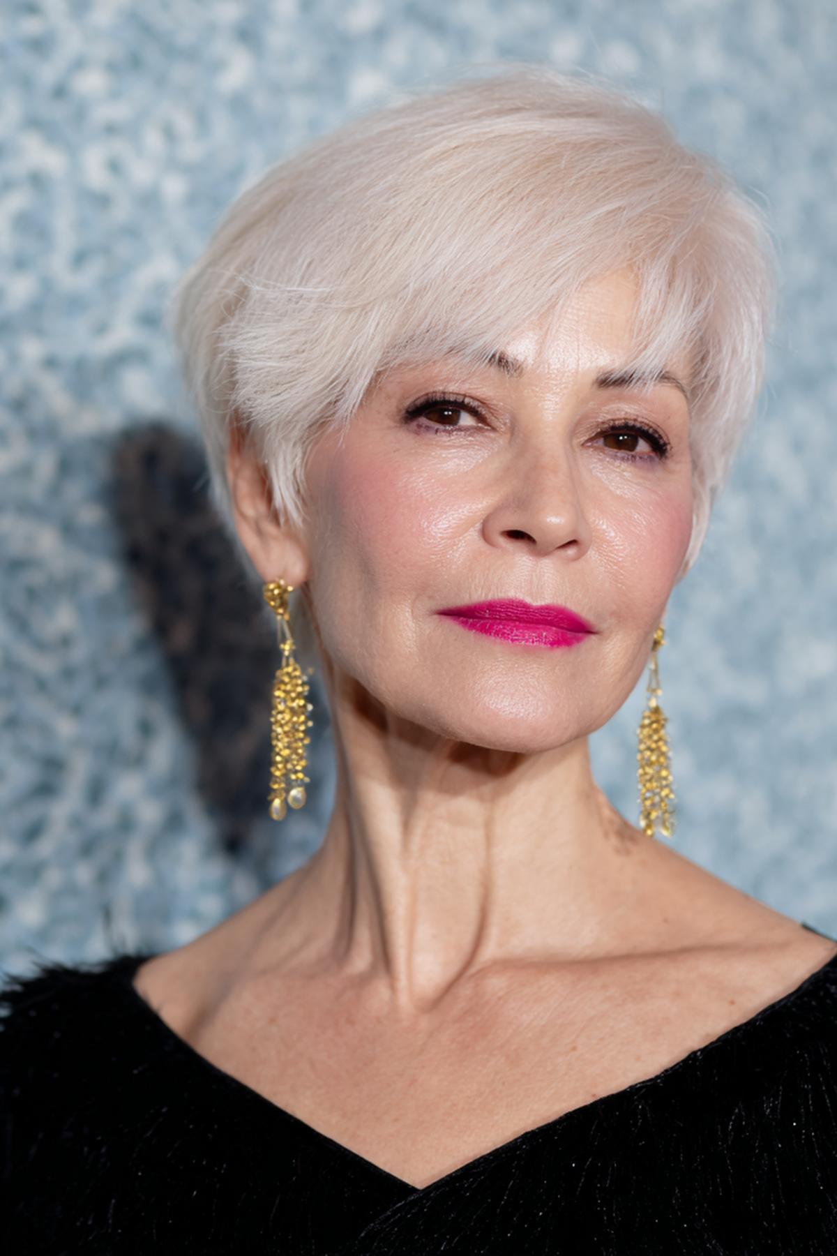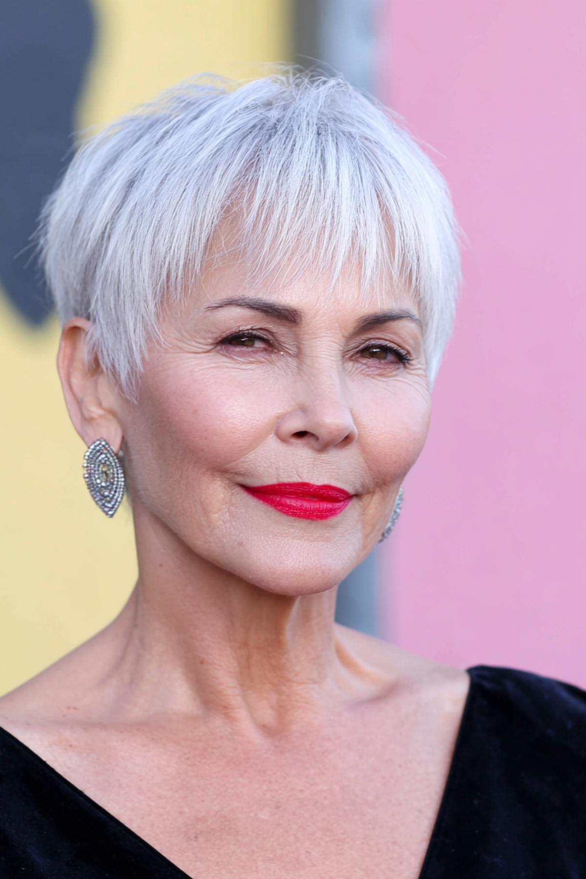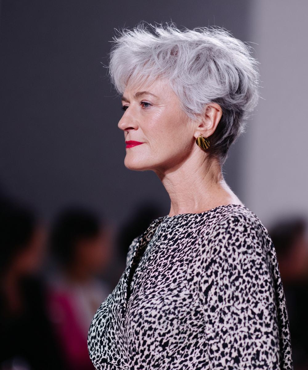 • Gebruik zilvershampoo af en toe om grijze tinten helder te houden (zachte pixie met luchtige pony).
