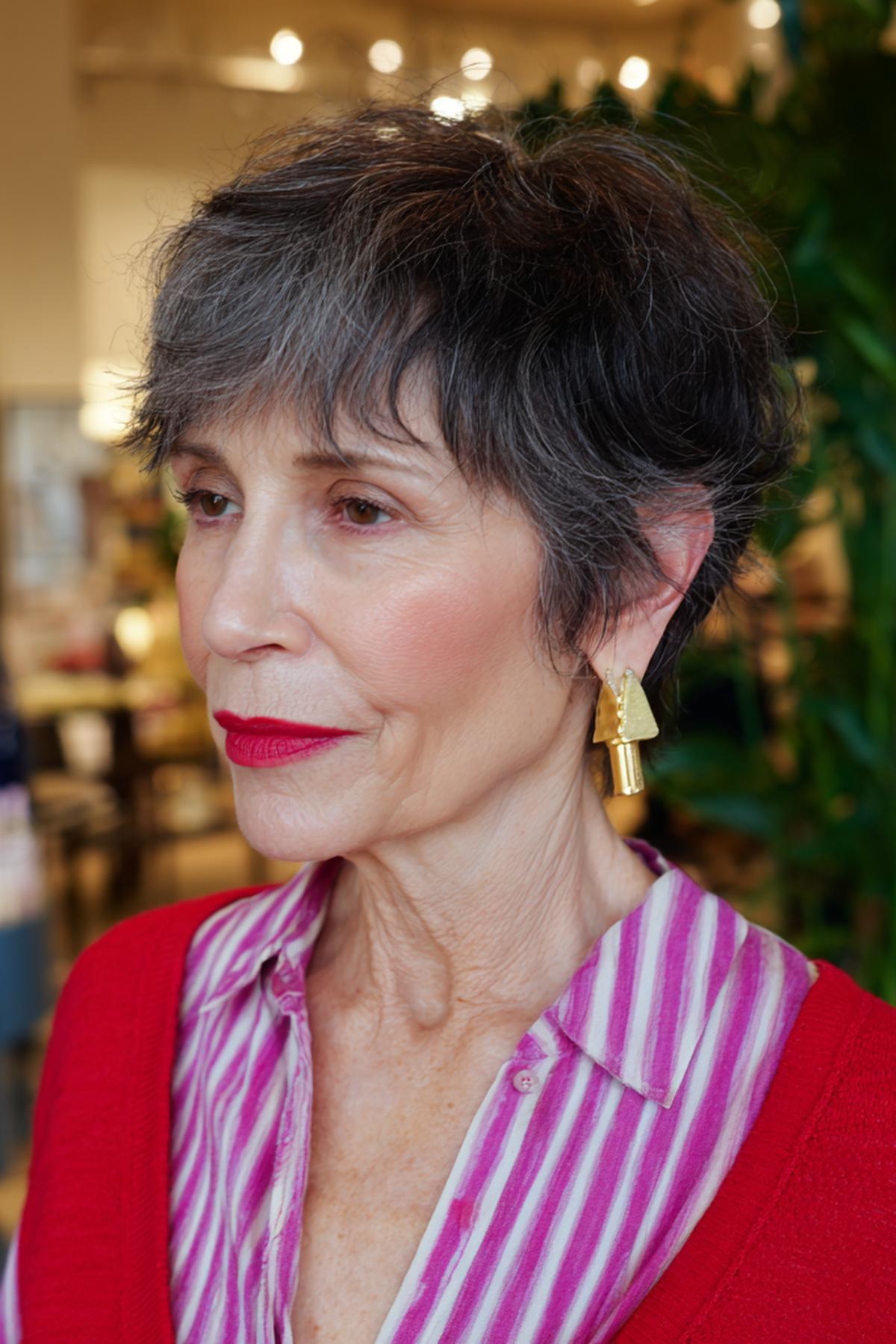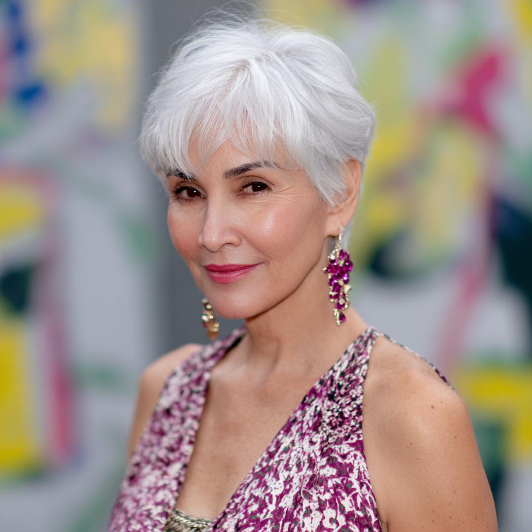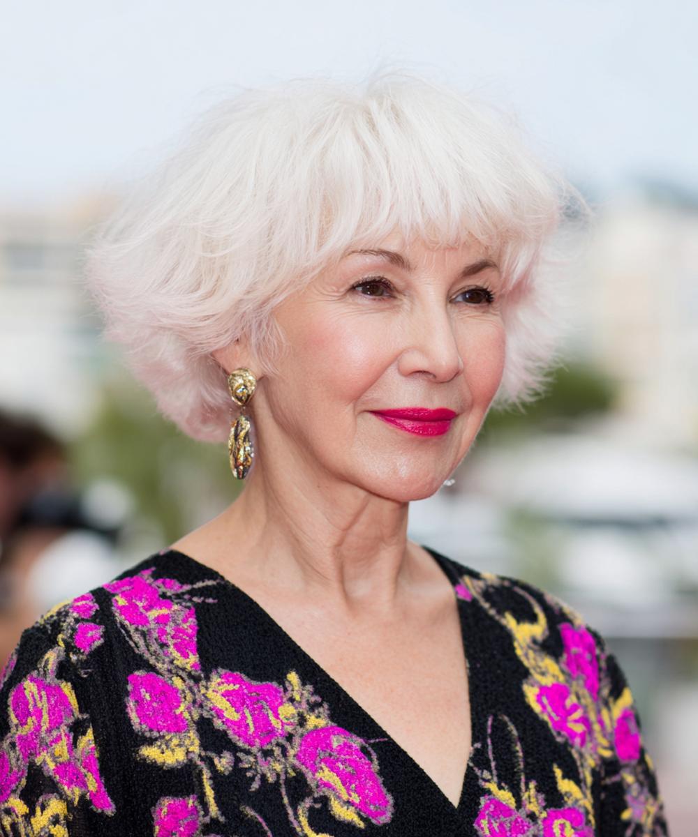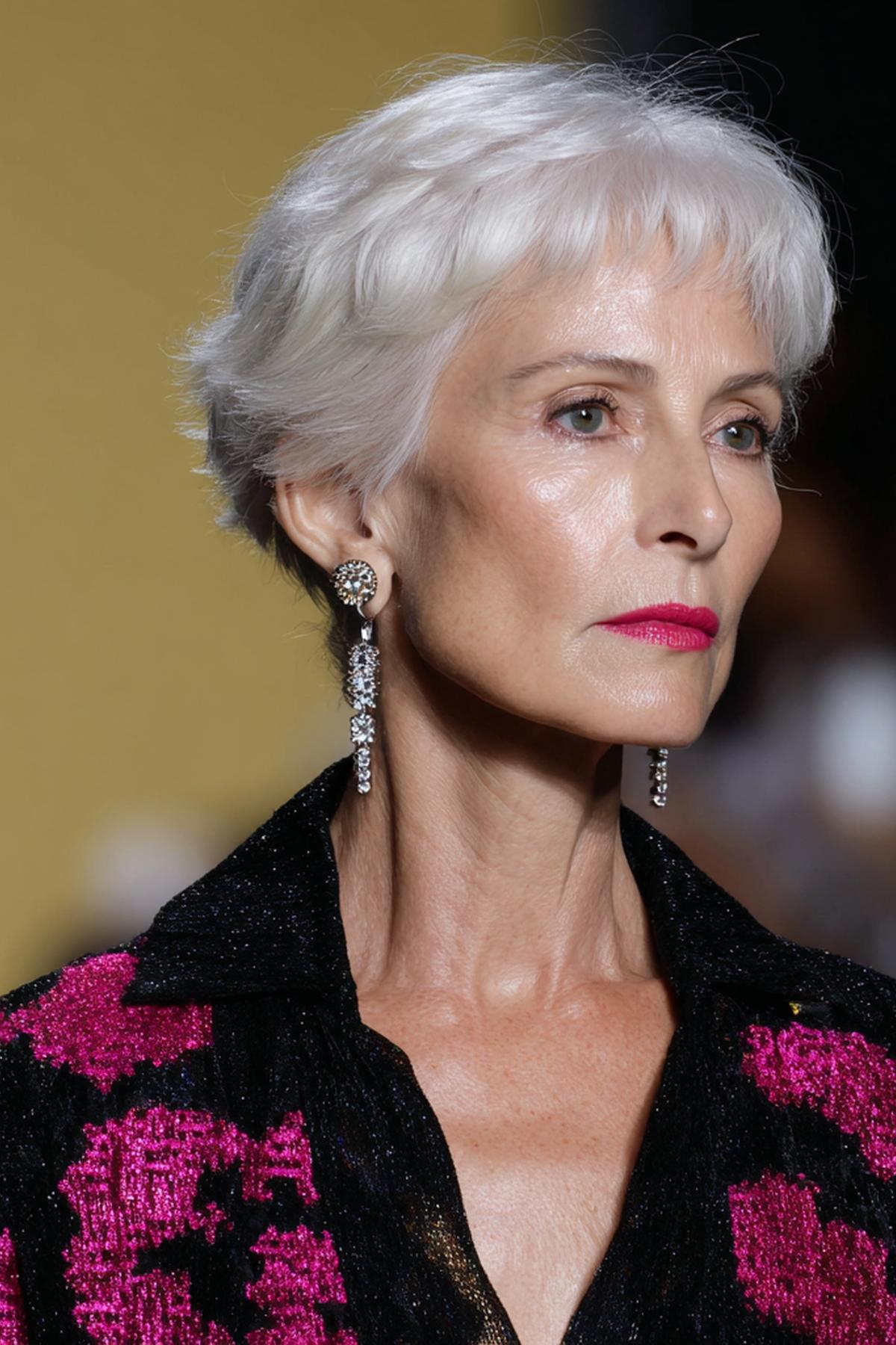 • Gebruik zilvershampoo af en toe om grijze tinten helder te houden (zachte pixie met luchtige pony).