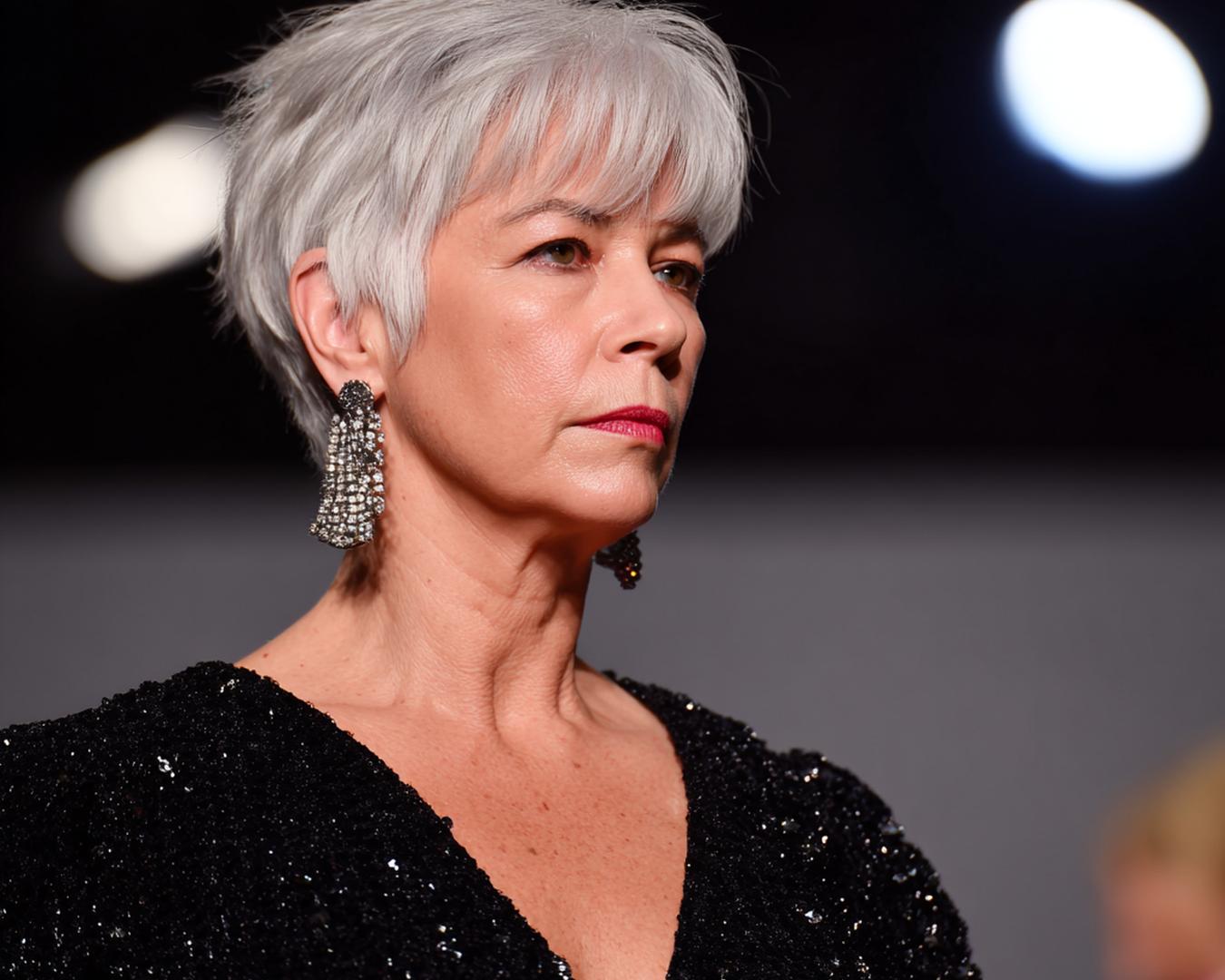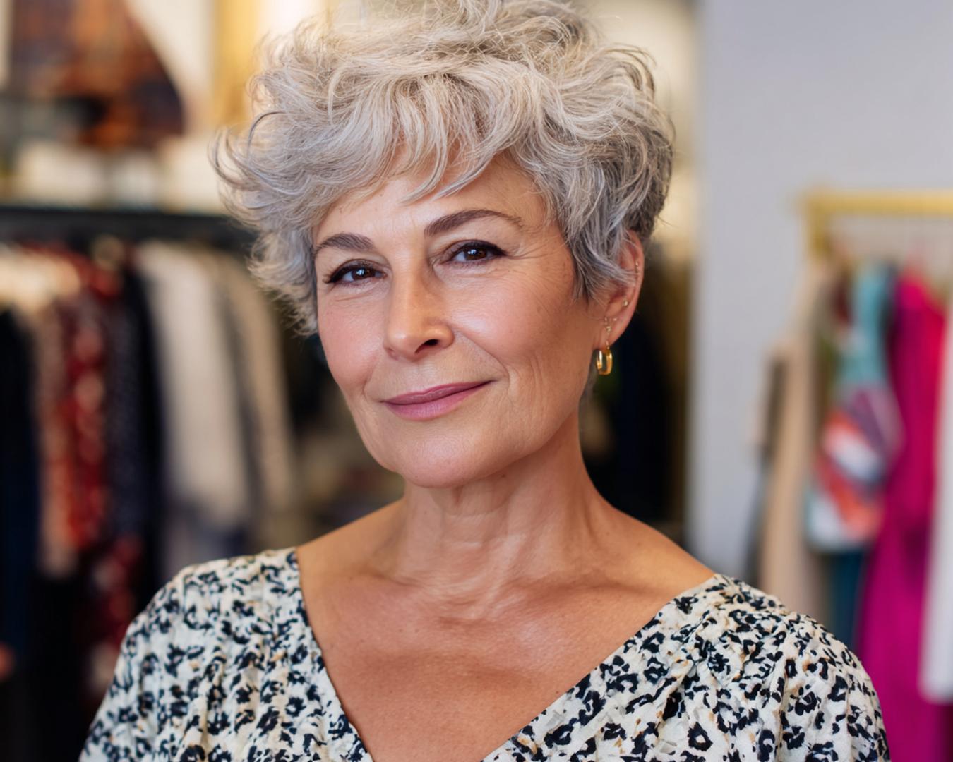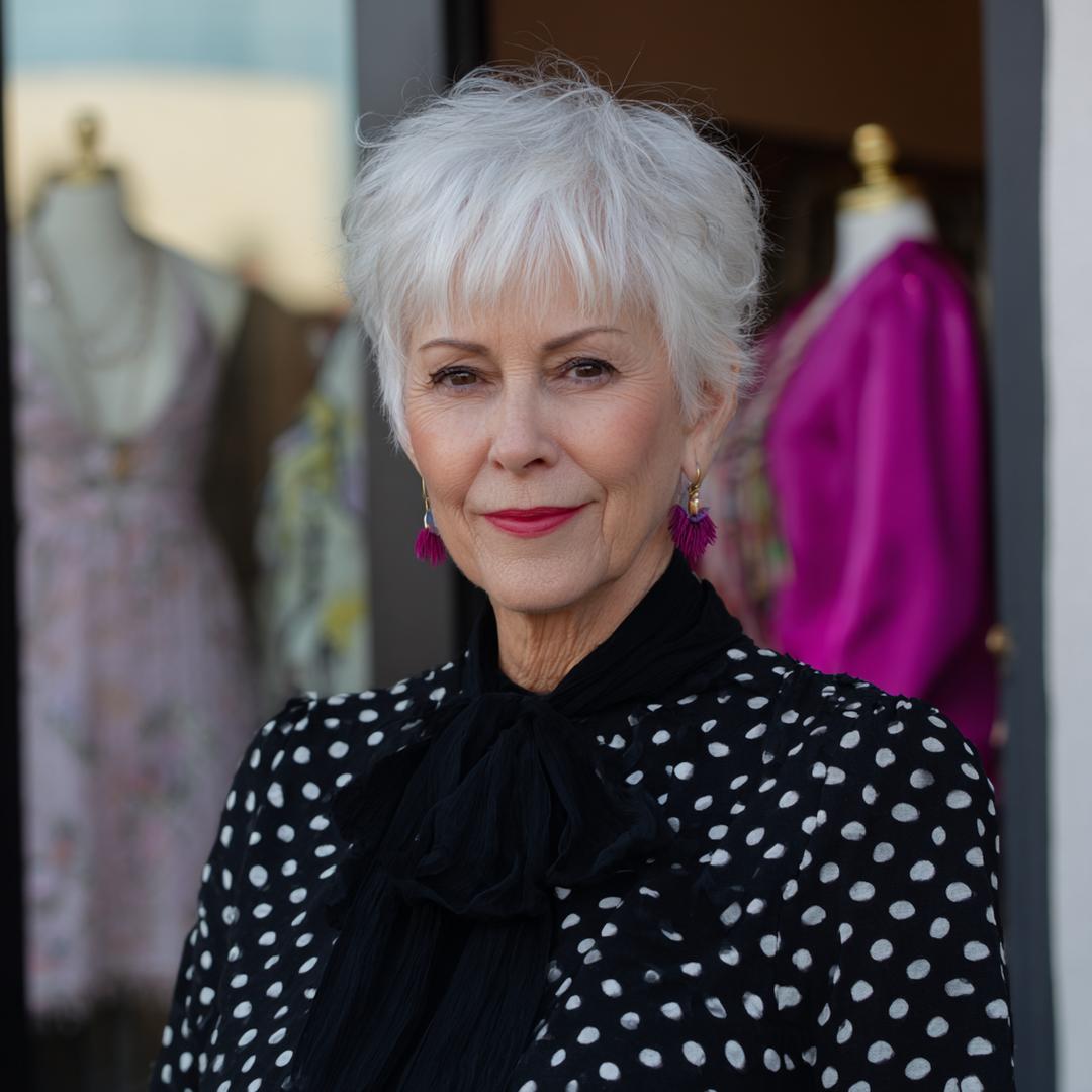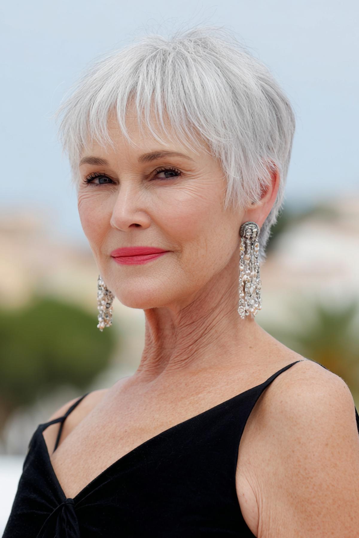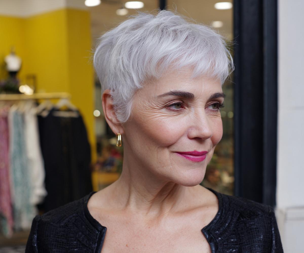 Een korte pixie met luchtige lagen die grijs mooi laat uitkomen. Werkt goed bij fijn tot medium haar en accentueert jukbeenderen. Ideaal voor wie een frisse, moeiteloze look wil. Mijn tip: föhn met ronde borstel voor zachte ronding en eindig met matte pasta voor definitie.