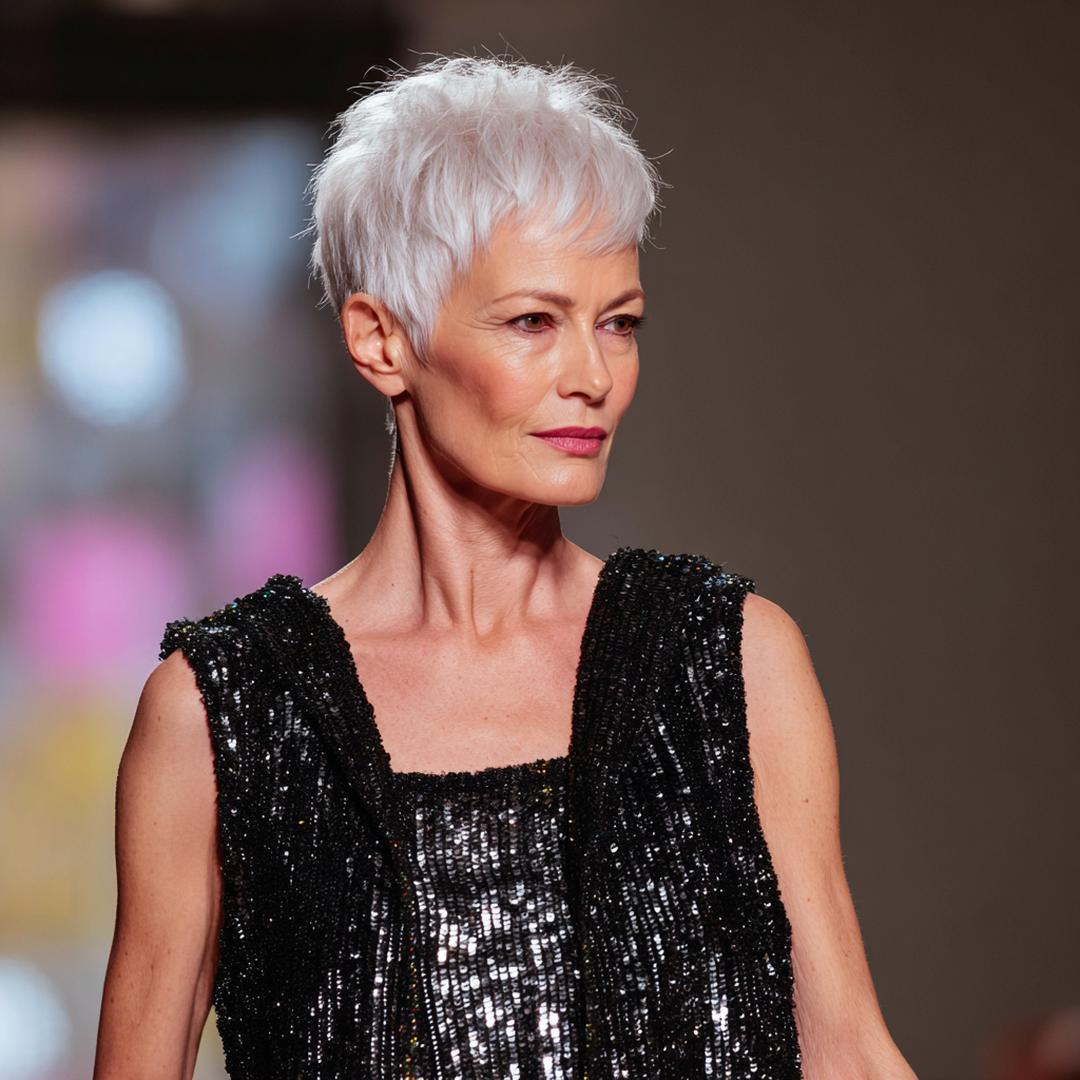 Korte, spiky pixie met gegradueerde zijkanten en veel toptextuur. Trekt het oog omhoog en geeft energie aan zilver haar. Werkt bij rechte tot grove haarstructuren en bij korte voorhoofden. Breng pasta in op droog haar, knijp willekeurig, laat de randen speels.