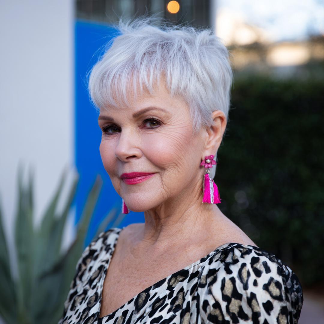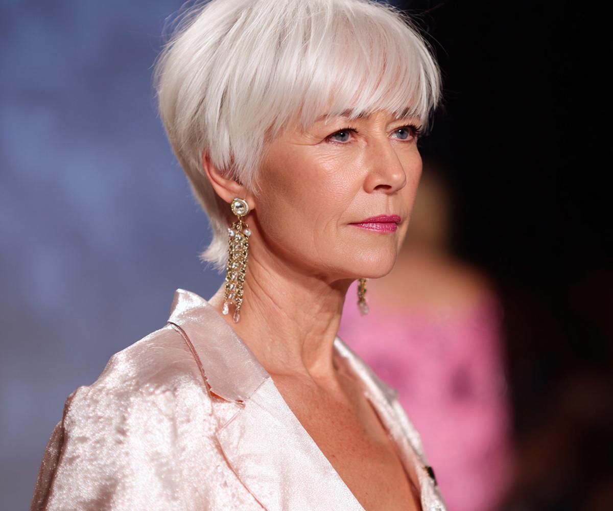 Een frisse, korte look voor 50+. De luchtige pony verzacht gelaatstrekken; de kruin heeft volume zonder te verzwaren. Ideaal bij fijn tot medium haar en ovale of hartvormige gezichten. Föhn met ronde borstel, werk af met lichte paste. Zilvershampoo houdt de tint helder.