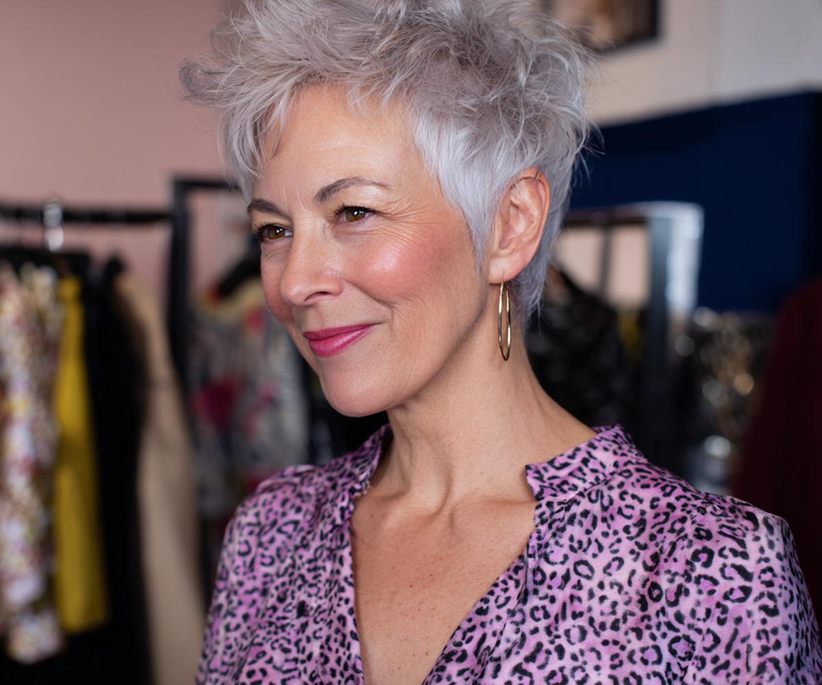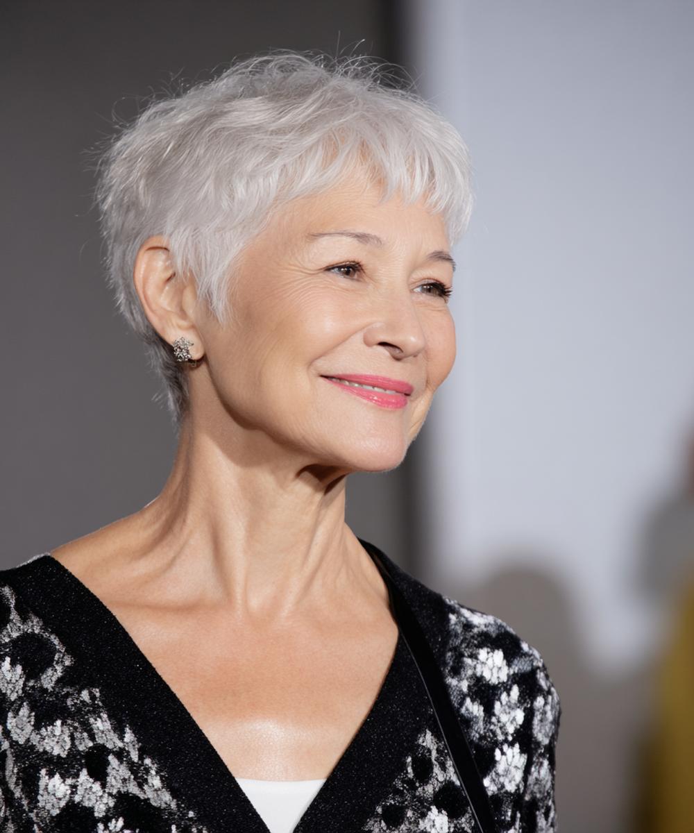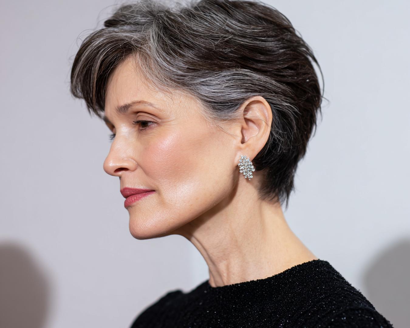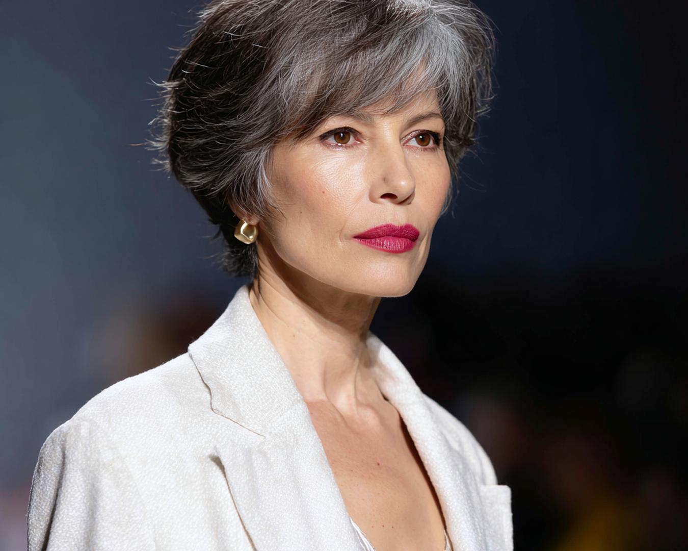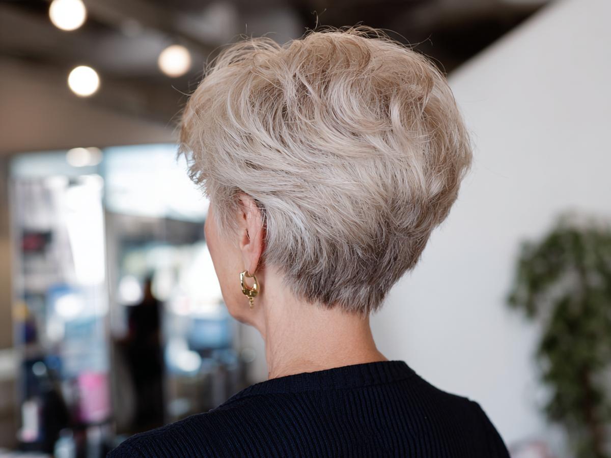 Grijs haar komt tot leven met een kort, luchtig model en gefilterde textuur. Het licht op de laagjes geeft diepte zonder veel product. Ideaal voor wie snel klaar wil zijn. Past bij ovale, lange en hartvormige gezichten.