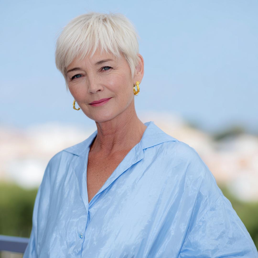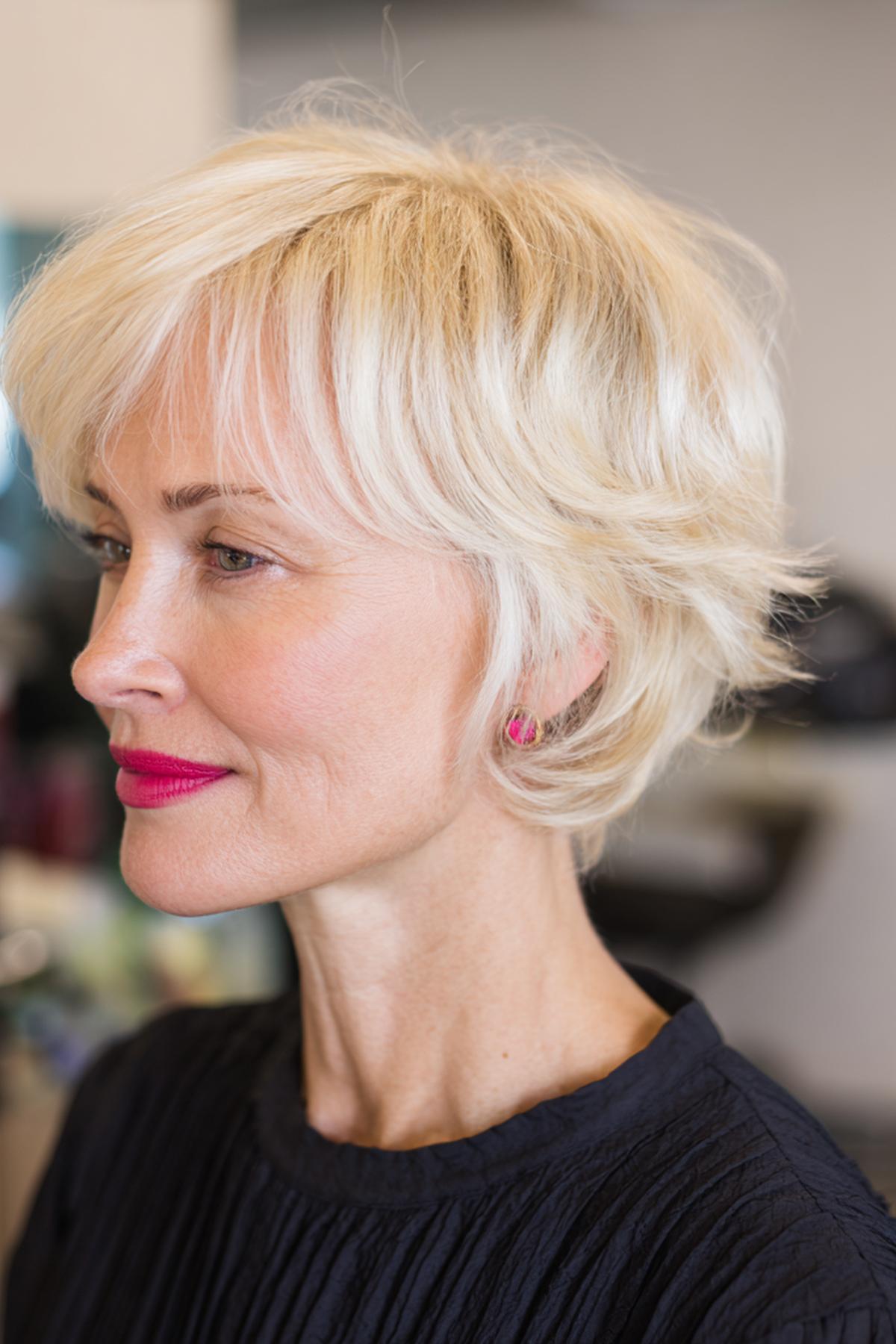 Een korte, gelaagde pixie met zachte pony en lichte textuur. Voor 50+ geeft dit volume aan fijner haar en legt de nadruk op de ogen. Prachtig bij ovale of hartvormige gezichten. Met een beetje paste en vingers ben je zo klaar; houd de contouren zacht voor een frisse, vlotte uitstraling.