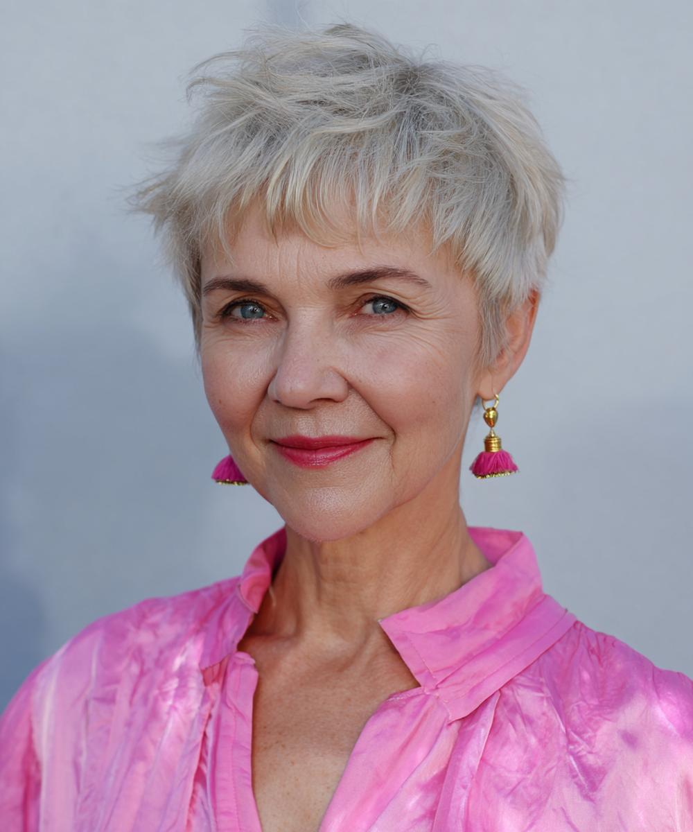 Getextureerde pixie met piekerige lagen en koele zilvertonen. Modern en pittig, accentueert jukbeenderen en ogen. Werkt uitstekend bij fijn haar. Breng een matte klei aan bij de aanzet voor lift en scheid de punten met de vingers. Onderhoud de tint met paarse shampoo voor frisheid.